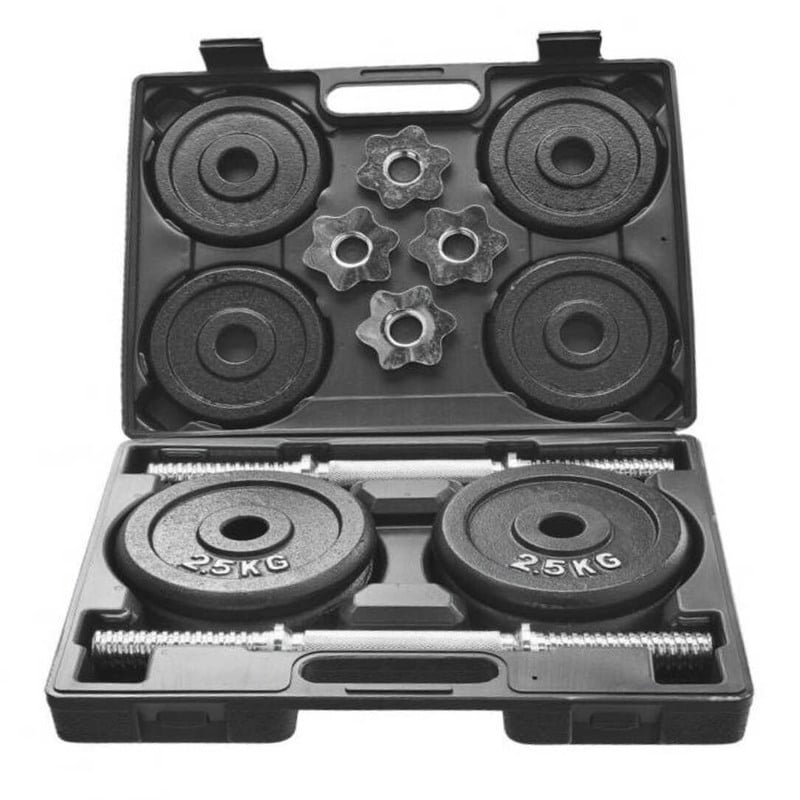 סט משקולות איכותי 20 ק"ג במזוודה הכולל: 2 מוטות קצרים 35 ס"מ, 4 כוכביות נעילה מתברגים, 4 משקולות צלחת 2.5 ק"ג, 4 משקולות צלחת 1.25 ק"ג.